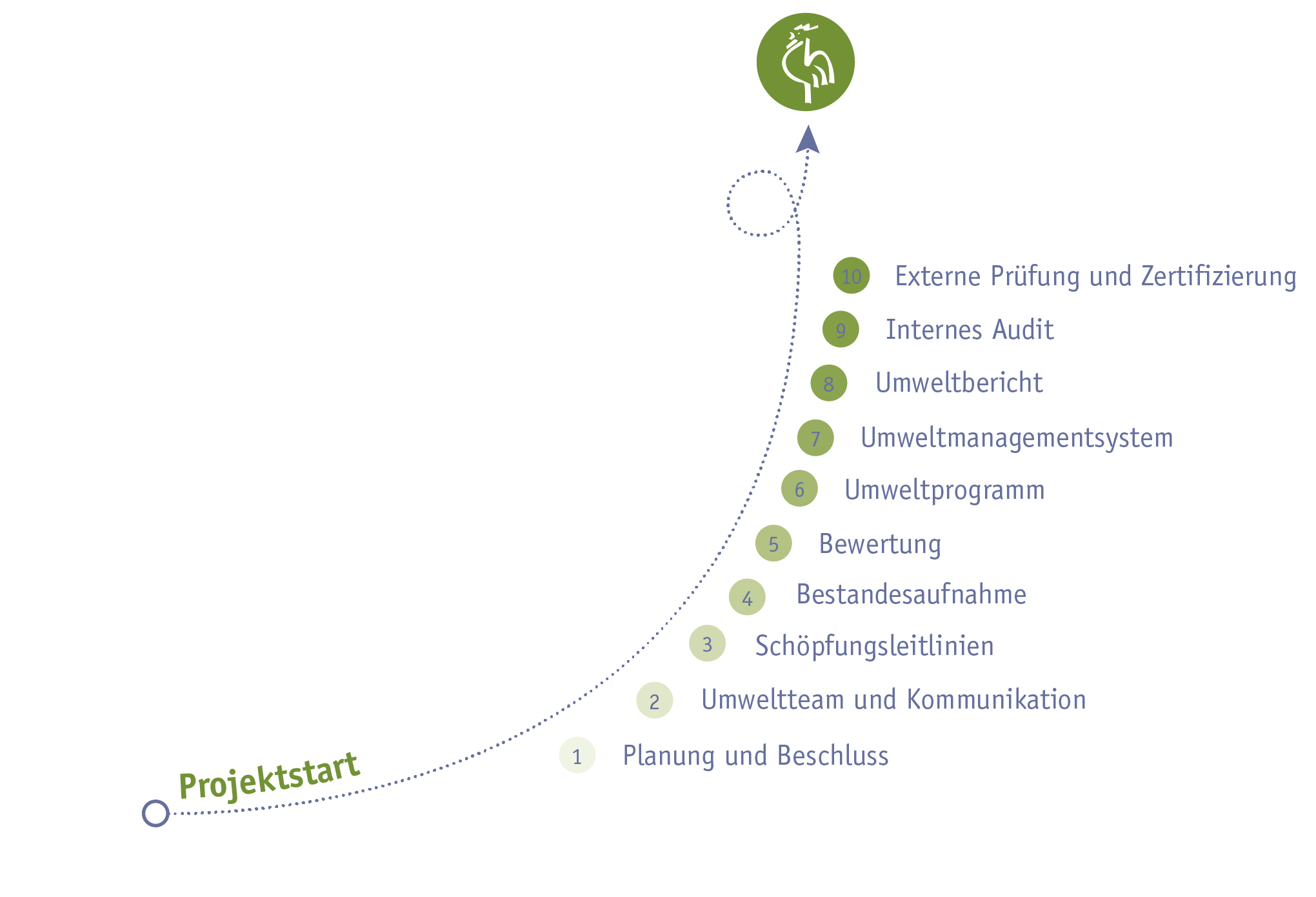 Das Umweltmanagementsystem ist in 10 Schritte unterteilt.